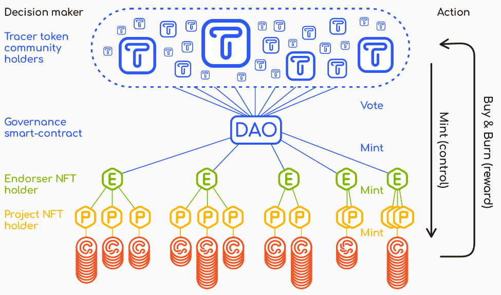 2. **Endorser and project oversight**: In addition to granting the Endorser status, the DAO has the power to revoke Endorser NFTs or Project NFTs if they are found to misrepresent their performance or engage in fraudulent activities. This oversight mechanism helps maintain the integrity of the Tracer ecosystem and protects buyers from low-quality or fraudulent carbon credits.